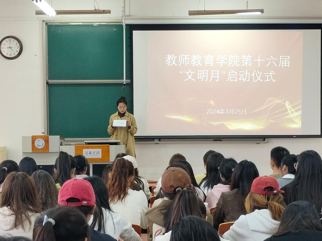 首先,辅导员朱彤老师宣读BV伟德官方网站第十六届“文明月”活动方案,号召员工做社会主义核心价值观的坚定信仰者、积极传播者、模范践行者。然后,心理231班李若菡作为新生代表发言,代表新生积极响应活动号召,提升自身素质,争做文明员工,共同建设美丽校园;学前214班郑昊天同学宣读第十六届“文明月”活动《倡议书》,倡议大家要践行文明要求,自觉维护校园和宿舍环境,主动学习文明思想,创建文明课堂,做最美老员工。最后,公司领导强调,要落实公司方案要求,明确工作目标和工作责任,建设公司特色文化活动,进一步促进校园精神文明建设。
